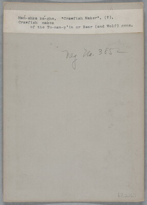 u.l. to u.r. printed on paper label: Man-shka ka-ghe, "Crawfish Maker", (?), \ Crawfish makes \ of the Tu-nan-p'in or Bear (and Wolf) gens.
