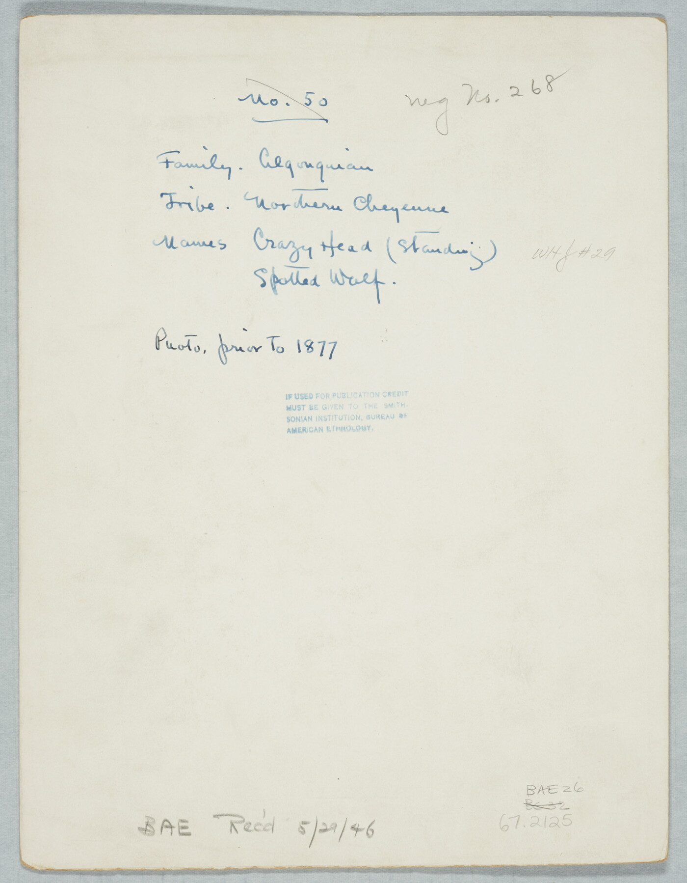 u.c. in ink: No. 50 [crossed out] \ Family. Algonquian \ Tribe. Northen Cheyenne \ Names Crazy Head (Standing) \ Spotted Wolf. \ Photo. prior To 1877