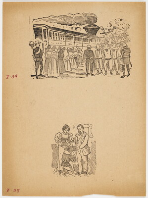 [Crowd and train; couple with child]