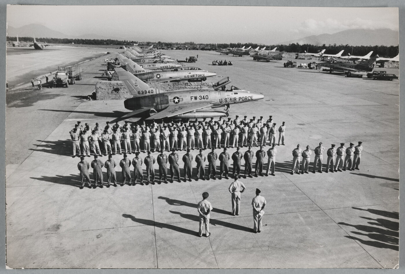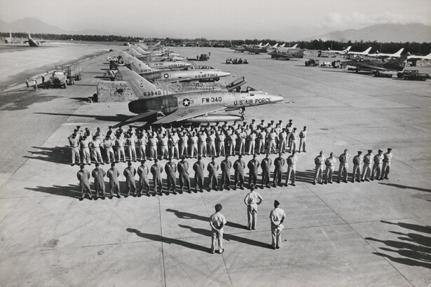 u.c. in blue porous point pen: x Vietnam - Pol - Rev. - Viet Cong / (Da Nang airbase, S. Vietnam, Center of / air activity against North Vietnam / at presentation ceremony of Air Medals / to US pilots in 1st air Raid against north V. / (F100 planes lined up) / x US AF - in FC - Vietnam / x USAF - Air - Units - 613 th Tactical Fighter Squadron / x USAF - Aircraft - Planes - Fighters F-100