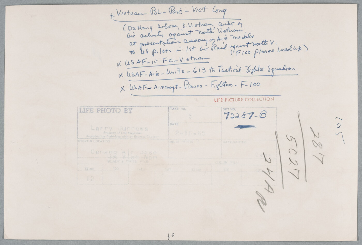 l.c. blue ink stamp: LIFE PHOTO BY / Larry Burrows / Property of Life Magazine Reproduction Forbidden without Express Consent / Take No. 5 / Date 2-26-65 / Set No. 72287-B / Story & Location Denang Air Base in Viet-nom / Reporter / Dept. / No. of Prints / BLACK & WHITE FILM / 35 mm 12 / 120 / Pack / Cut / COLOR FILM / 35 mm / 120 / Cut