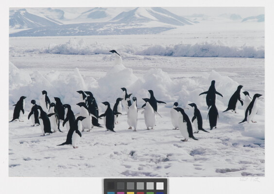 u.l. [stamp]: PHOTOGRAPH \ By \ ELIOT PORTER \ No. [in ink]: Roll 49, No. 31 \ [stamp]: Title [in ink]: Adélie Penguins \ McMurdo Sound \ Antarctica