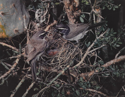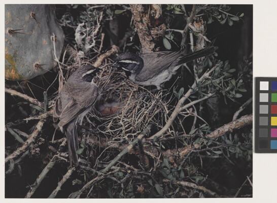 u.l. [stamp]: PHOTOGRAPH \ By \ ELIOT PORTER \ No. [in ink]: 15-6-18-1 \ [stamp]: Title [in ink]: Black-throated \ Sparrows