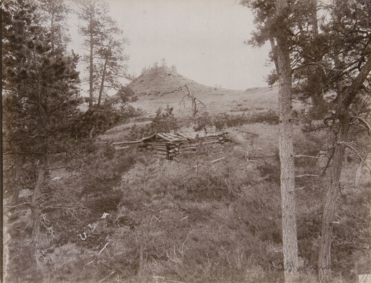 u.c. in graphite: Relic of the 70's \ Old Buffalo Hunters Camp--Breaks of Missouri \ built 1879 photographed 1901 \ Huffman hunted buffalo here in 79 \ the tall hill in background was the lookout \ point for spotting the buffalo herds