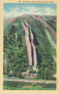 u.l. printed: The Devil's Slide is one of the many novel \ scenic attractions in Weber Canyon. This \ beautiful canyon is traversed by a magnificent \ paved highway which is a link in one of the \ great overland routes between Utah and the \ East. In the main this route follows the roads \ built by the early "Mormon" pioneers.