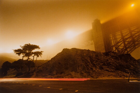 [Golden Gate Bridge silhouetted by beacon lights], 1979