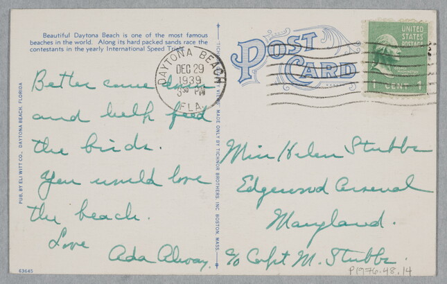 c. to l.r. in green ink: Miss Helen Stubbs \ Edgewood Arsenal \ Maryland \ c/o Capt M. Stubbs.