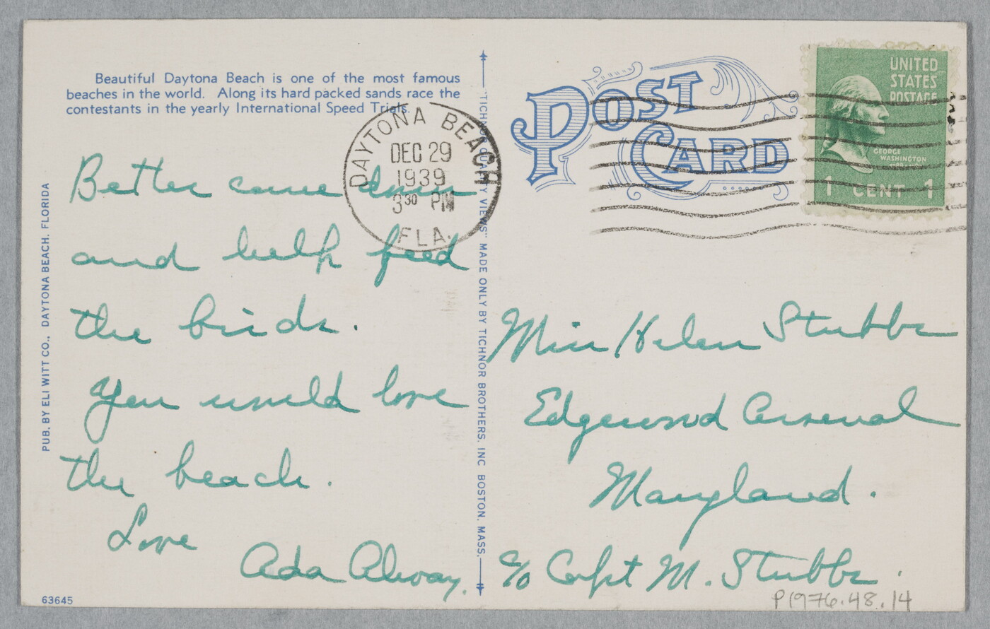 u.c. [stamp]: DAYTONA BEACH \ DEC 29 \ 1939 \ 300 PM \ FLA.