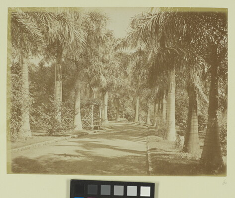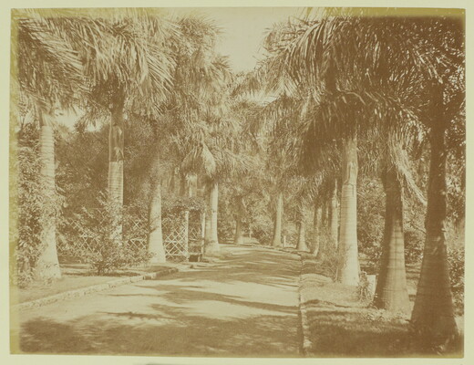 [Driveway lined with large palm trees]