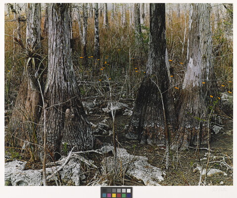 l.l. stamped in black: TREES \ A Portfolio of Dye Transfer Prints by \ Eliot Porter \ [underlined] Dry Cypress Swamp \ Tamiami Trail, Florida \ February 1974 \ Number [in graphite] AP2 of [in graphite] 7