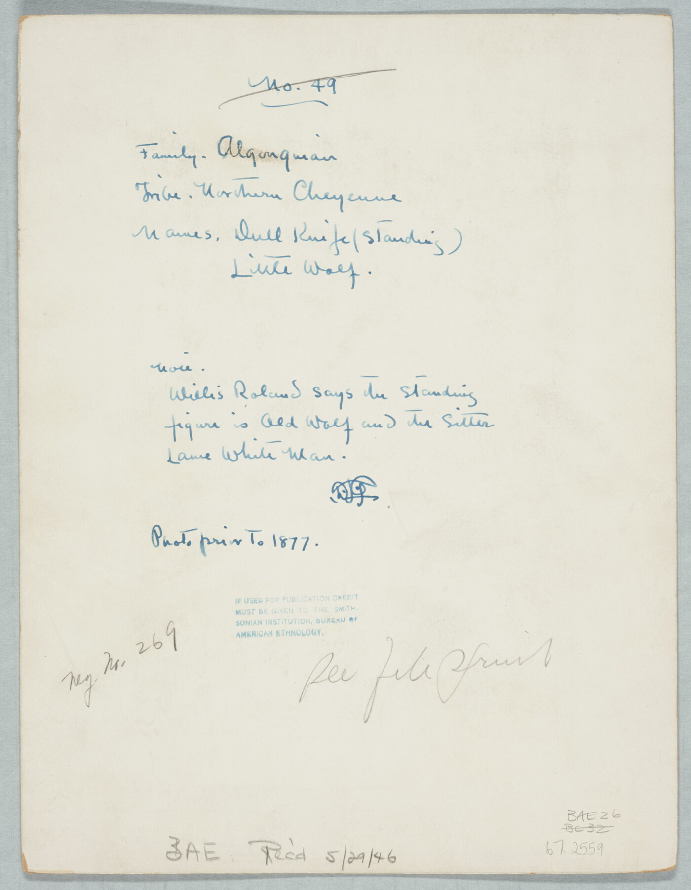 c. in ink: Note- \ Willis Rolad says the standing \ figure is Old Wolf and the Sitter \ Lame White Man. \ DLG \ Photo prior To 1877.