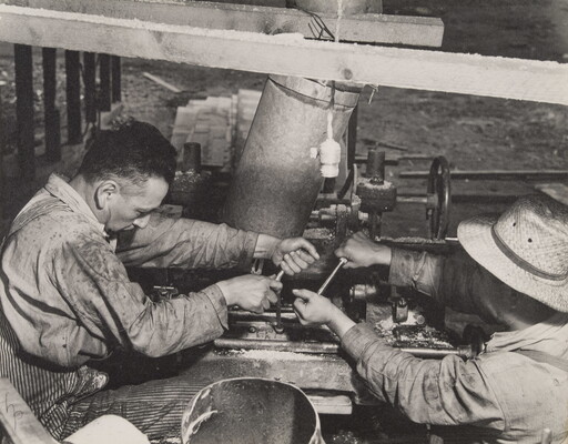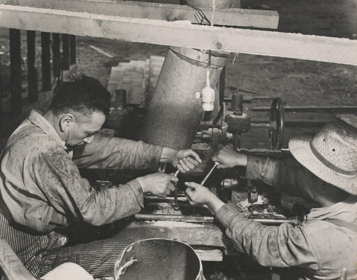 u.c. in graphite: Dupr.? \ [in ink] Dupre \ Brothers who own and operate lumber mill \ on Flathead Reservation, change saw blades at \ lunch time.
