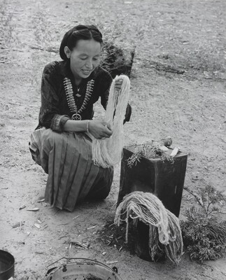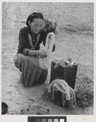 u.l. on paper label: [printed]: A PHOTOGRAPH BY \ LAURA GILPIN \SANTA FE, NEW MEXICO \ [typed]: DYEING WOOL WITH A NATIVE \ PLANT. 1951. \ from THE ENDURING NAVAHO \ UNIVERSITY OF TEXAS PRESS. PUB.
