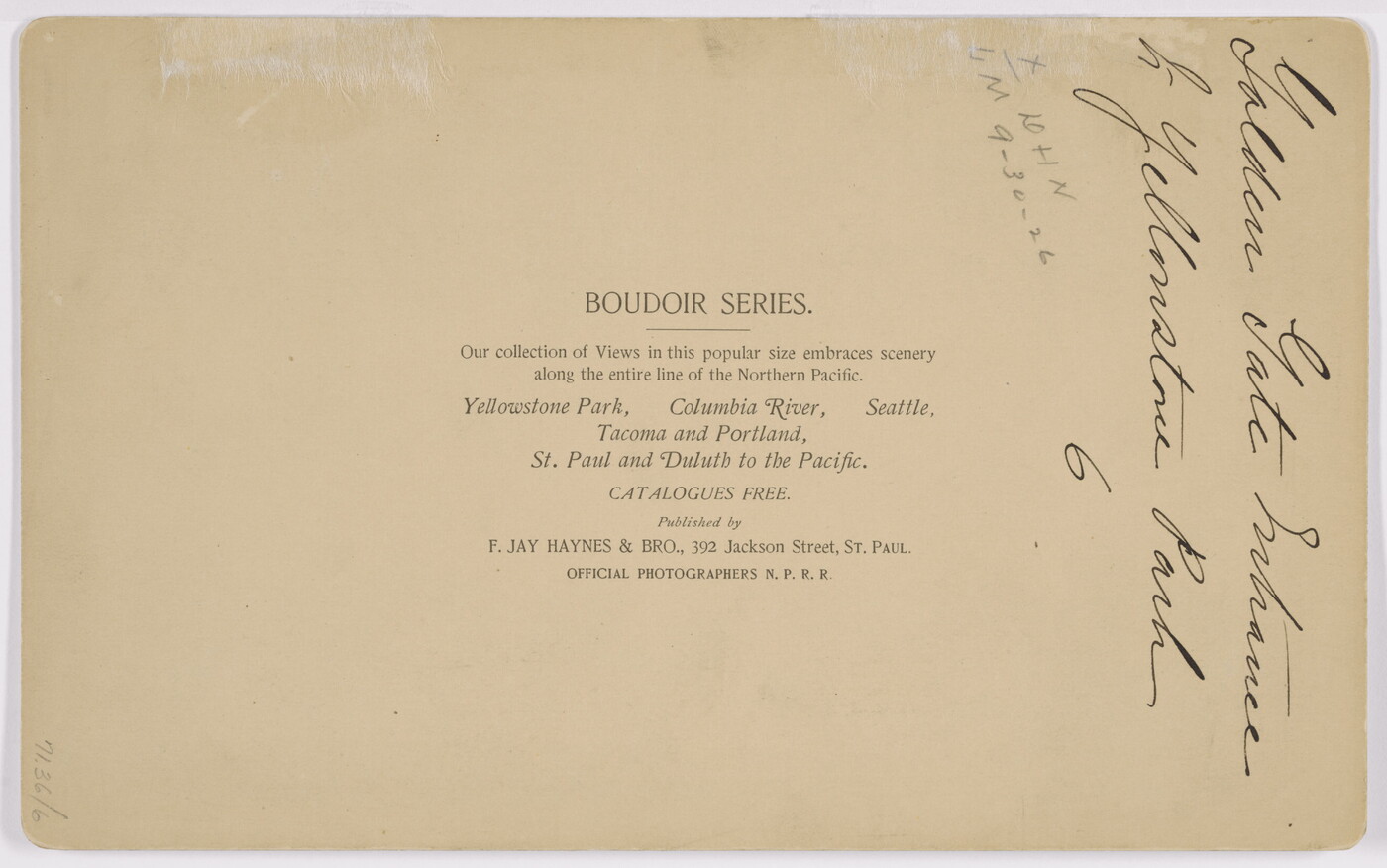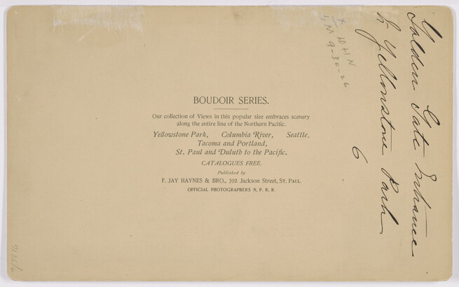 c. printed: BOUDOIR SERIES. \ Our collection of Views in this popular size embraces scenery \ along the entire line of the Northern Pacific. \ Yellowstone Park, Columbia River, Seattle, \ Tacoma and Portland, \ St. Paul and Duluth to the Pacific. \ CATALOGUES FREE. \ Published by \ F. JAY HAYNES & BRO., 392 Jackson Street, ST. PAUL. \ OFFICIAL PHOTOGRAPHERS N.P.R.R.