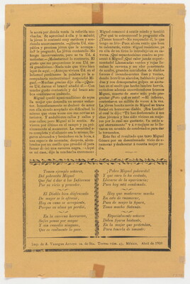 l.l. to l.r.: Imp. de A. Vanegas Arroyo. 2a. de Sta. Teresa núm 43, México, Abríl de 1910