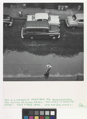 l.l. to l.r. in green marker: THIS IS A NEGATIVE XMASCARD FOR PHOTOGRAPHERS. \ THE POSITIVE MESSAGE READS: 'HOW LOVELY IS SANTA FE!' \ ENJOY! HAVE A GOOD YEAR! LOVE AND GOOD WISHES! [signed]: Ellen
