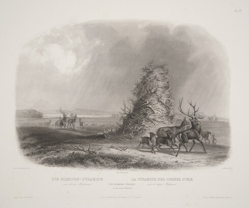 l.c.: Imp. de Bougeard \ DIE ELKHORN - PYRAMIDE LA PYRAMIDE DES CORNES D'ELK \ am obern Missouri THE ELKHORN PYRAMID sur le haut Missouri \ London, published by Ackermann & Co, Strand \ [blind stamp] C. BODMER \ Direct
