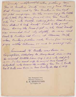 u.c. to l.c. in ink: "Dandy", with Emanuel H. Custer, father of Gen \ Geo. A. Custer. "Dandy" was one of two thoro- \ bred horses used by Gen. Custer in his last \ ill-fated campaign. On the morning of the battle \ of the Little Big Horn, June 15, 1876, Gen. Custer \ rode "Vie" into battle, ordering Jolen Backware \ (his striker) to take "Dandy" back to the pack \ train. During the [illeg.] fight on the hill, "Dandy" \ was wounded, but only slightly. He was sent \ backt o Custer's and home at Monroe, Mich. \ where Custer's father rode him for many \ years altho' between 75 and 80 years of age. \ Emmanuel H. custer was born in \ Ceryssoptown, Alleghany Co., Maryland, Dec. 10, 1806. \ He married Matilda Viers, Aug. 7, 1828, who died July \ 18, 1834. For his second wife he married Mrs. Israel R. \ Kirkpatrick, who became the mother of Gen. Geo. A. Custer. \ Geo. A. Custer was born in New Rawley, O., Dec. 5, 1839.