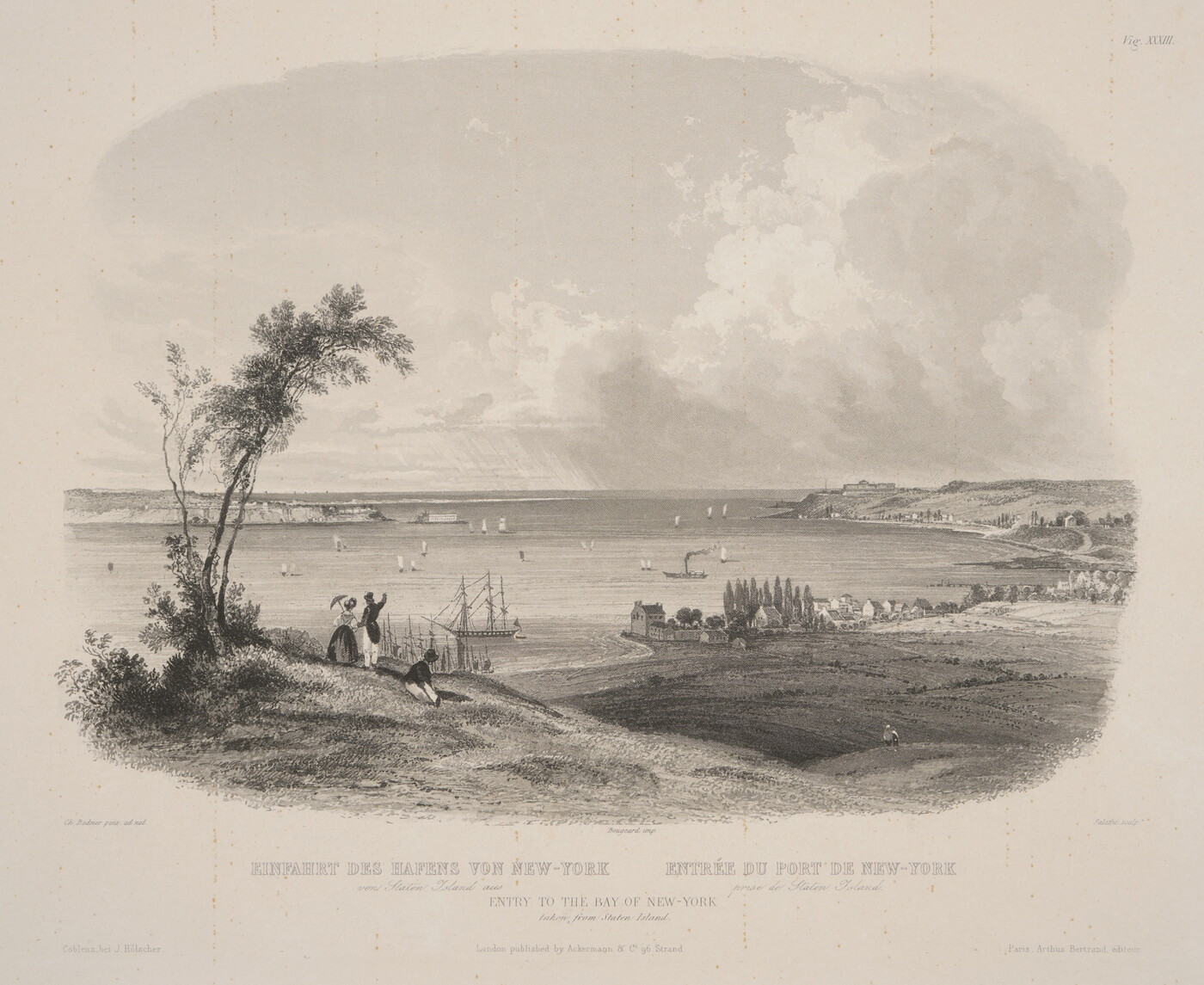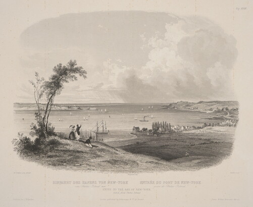 l.c.: Bougeard imp. \ EINFAHRT DES HAFENS VON NEW-YORK ENTRÉE DU PORT DE NEW-YORK \ von Staten Island aus prise de Staten Island \ ENTRY TO THE BAY OF NEW-YORK \ taken from Staten Island. \ London published by Ackermann & Co. 96 Strand \ [blind stamp]