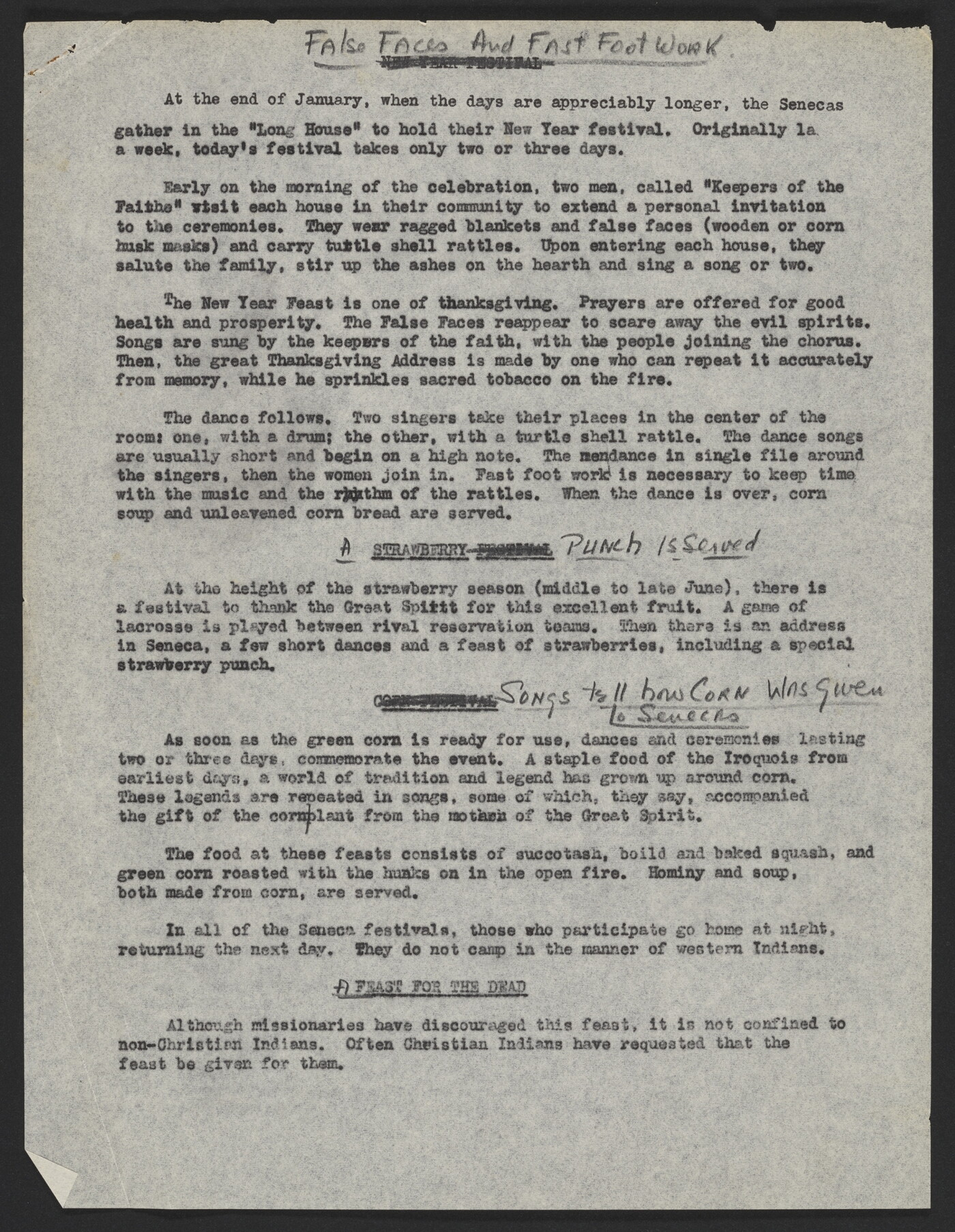 Typed document annotated. "False Faces and Fast Footwork." Articles on festivals.