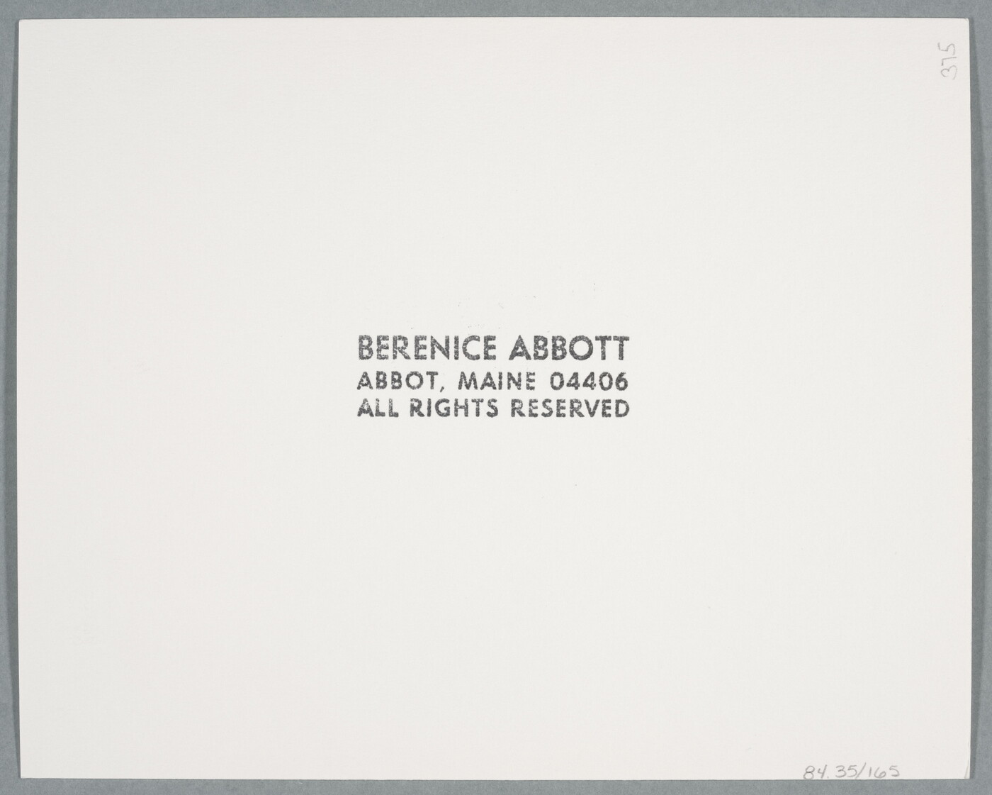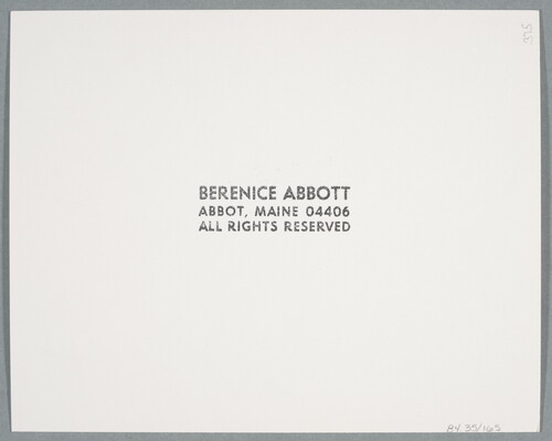 c. stamp: BERENICE ABBOTT \ ABBOT, MAINE 04406 \ ALL RIGHTS RESERVED