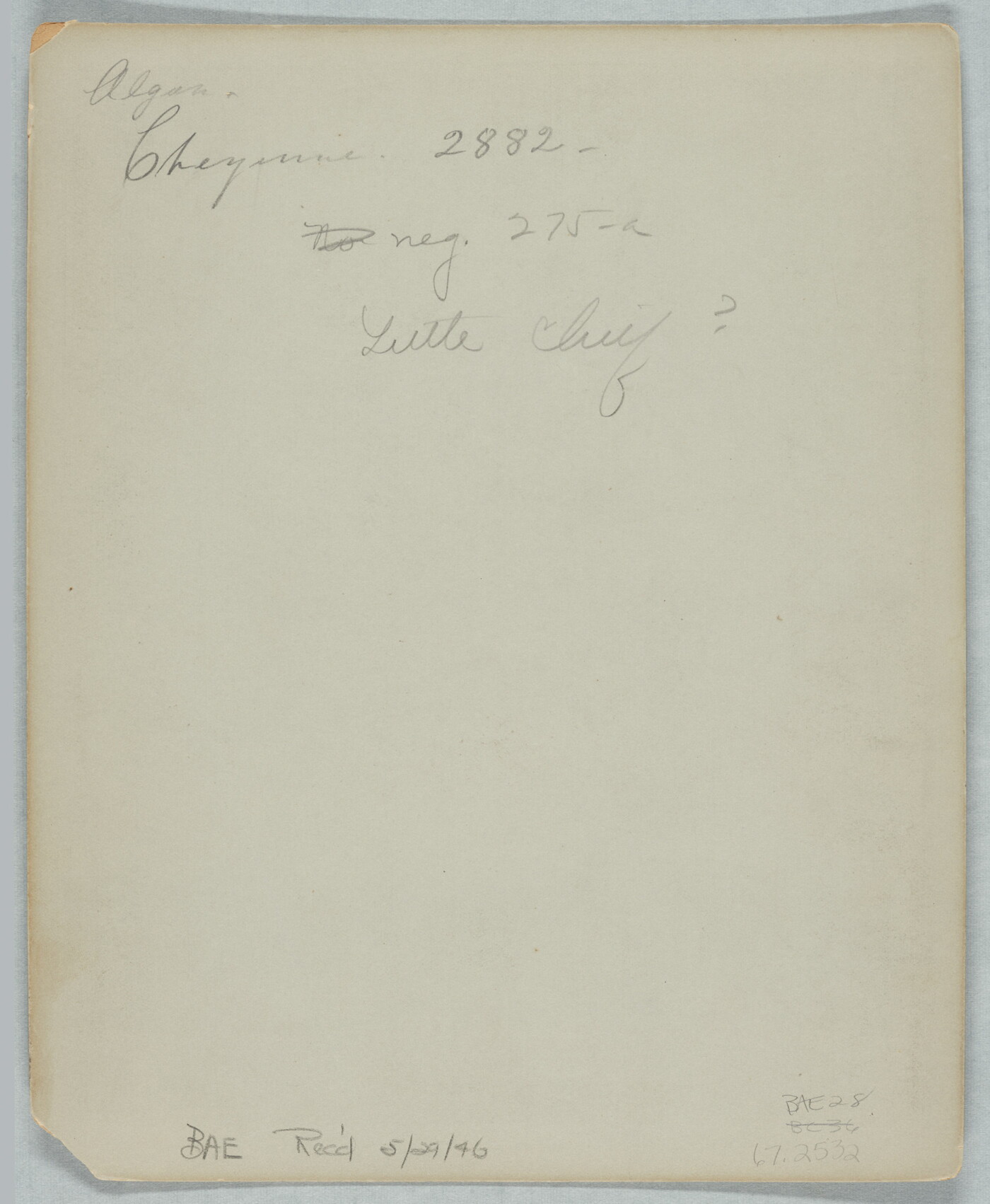 u.l. to u.c. in graphite: Algon. \ Cheyenne. 2882. \ No [crossed out] neg. 275-a \ Little Chief ?