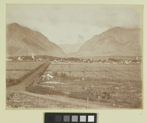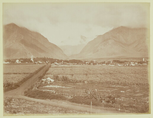 [Fields, roads, small town in valley, mountains and clouds in background]