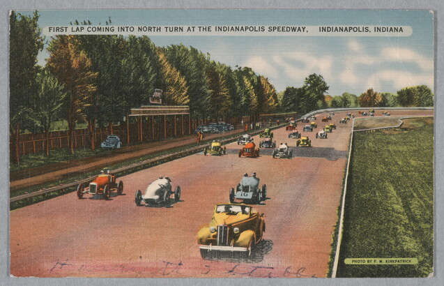 u.l. to u.r. printed in black: FIRST LAP COMING INTO NORTH TURN AT THE INDIANAPOLIS SPEEDWAY, INDIANAPOLIS, INDIANA