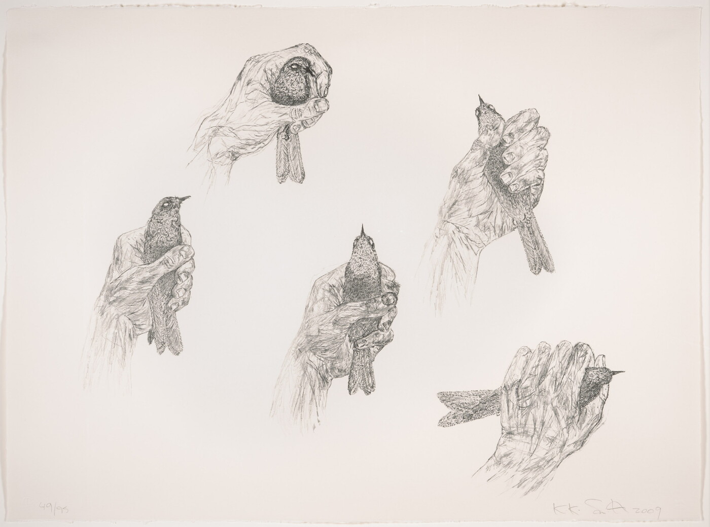 l.r. handwritten on paper label: Smith, Kiki / Untitled (Five Birds in hands) / Lithograph
