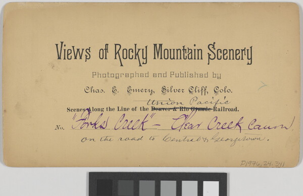 c. printed: Views of Rocky Mountain Scenery, \ Photographed and Published by \ Chas. E. Emery, Silver Cliff, Colo. \ Scenes along the Line of the Denver & Rio Grand [scratched out]