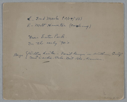 c. in blue ink: L- Fred Meek (11/29/58) \ R- Milt Hunter (cooking) \ Near Estes Park. \ In the eaarly '90's \ Boys Willis Hunter - Forest Ranger in southern Calif. \ Tom F. Vardie - Colo. Nat. Bk., Denver