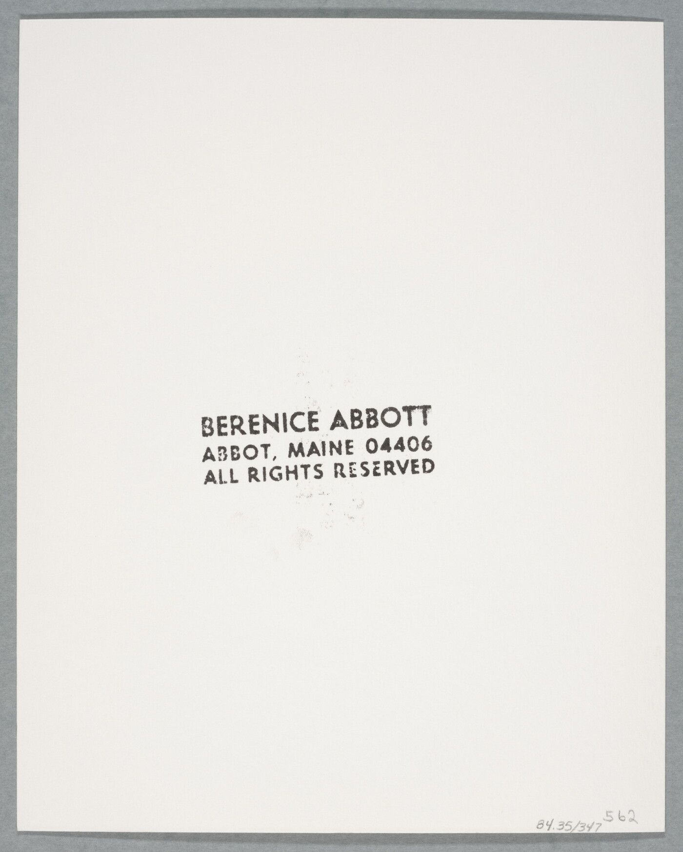 c. [stamp]: BERENICE ABBOTT \ ABBOT, MAINE 04406 \ ALL RIGHTS RESERVED