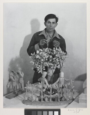 u.l. on paper label: [printed]: PHOTOGRAPHS \ BY LAURA GILPIN \BOX 1173, SANTA FE, NEW MEXICO \ [typed]: GEORGE LOPEZ - WOODCARVER OF CORDOVA \ 1945 \ From THE RIO GRANDE \ Duell, Sloan and Pearce, Publishers
