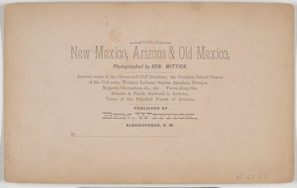 c. printed: VIEWS IN \ New Mexico, Arizona & Old Mexico, \ Photographed by BEN. WITTICK. \ Ancient ruins of the Caves and Cliff Dwellers, the Pueblos, Grand canon \ of the Colorado, Walapai Indians, Supias, Apaches, Navajos, \ Mojaves, Curiosities, etc., etc. Views along the \ Atlantic & Pacific Railroad in Arizona. \ Views of the Petrified Forest of Arizona. \ PUBLISHED BY \ BEN. WITTICK, \ ALBUQUERQUE, N. M. \ No.