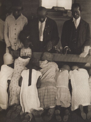 [Girls kneeling for prayer in church]