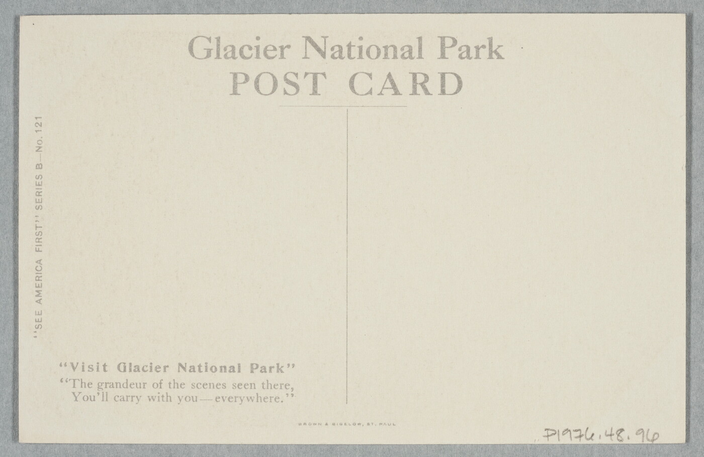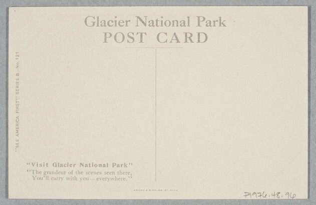 l.l. printed: "Visit Glacier National Park" \ "The grandeur of the scene there, \ You'll carry with you --- everywhere."