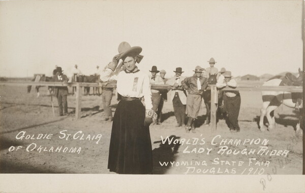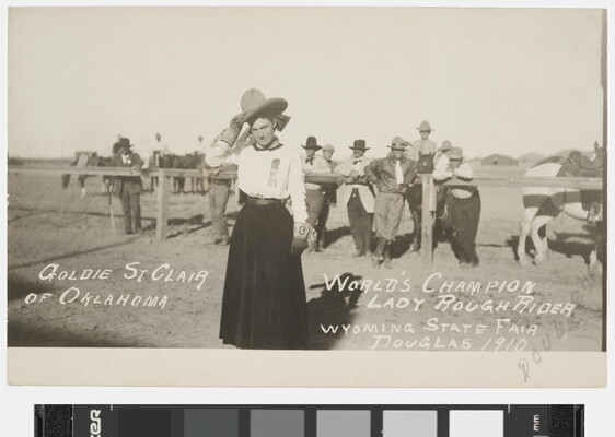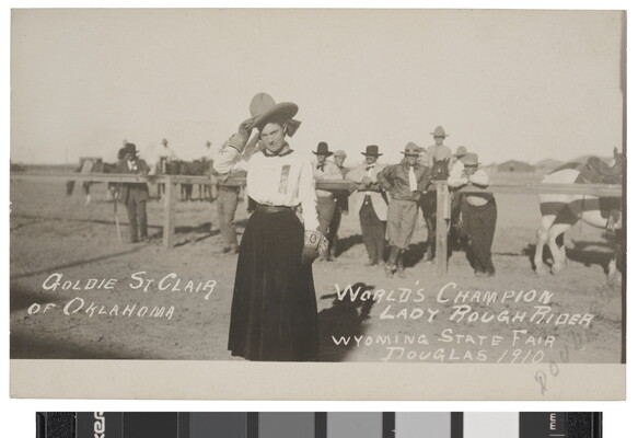 l.r. in image: WORLD'S CHAMPION \ LADY ROUGH RIDER \ WYOMING STATE FAIR \ DOUGLAS 1910