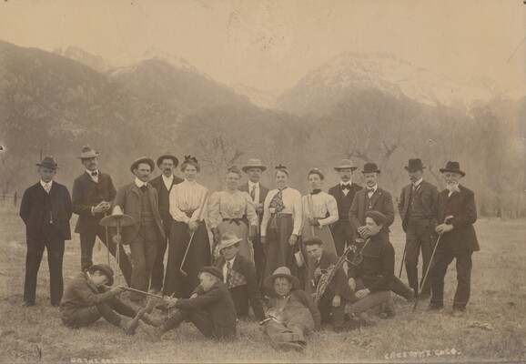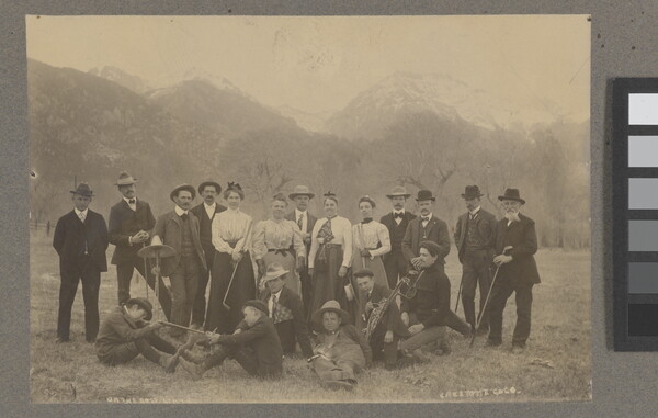 u.r. to u.l. in grahite: Standing L-R \ 1 \ 2 Mr Lord? \ 3 \ 4 \ 5 Mrs Lord? \ 6 \ 7 \ 8 Mrs DeWitt Travis \ 9 \ 10 [illeg.] \ 11 DeWitt Travis \ 12 Adam Shellabarger (son Ralph - Reto Alto & Moffat \ 13 - Ed Wales