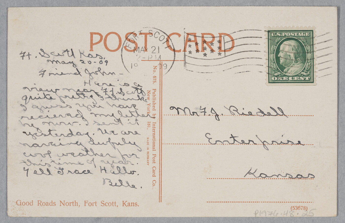 u.l. to l.c. in ink: Ft. Scott Kas. \ May 20-09 \ Friend John- \ Here is a \ view near Ft. Scott \ quite pretty I think. \ I guess you have \ received my letter \ by now. I sent it \ yesterday. We are \ haveing [sic] awfuly [sic] \ cool weather for \ this time of year. \ Tell Grace Hello. \ Belle.