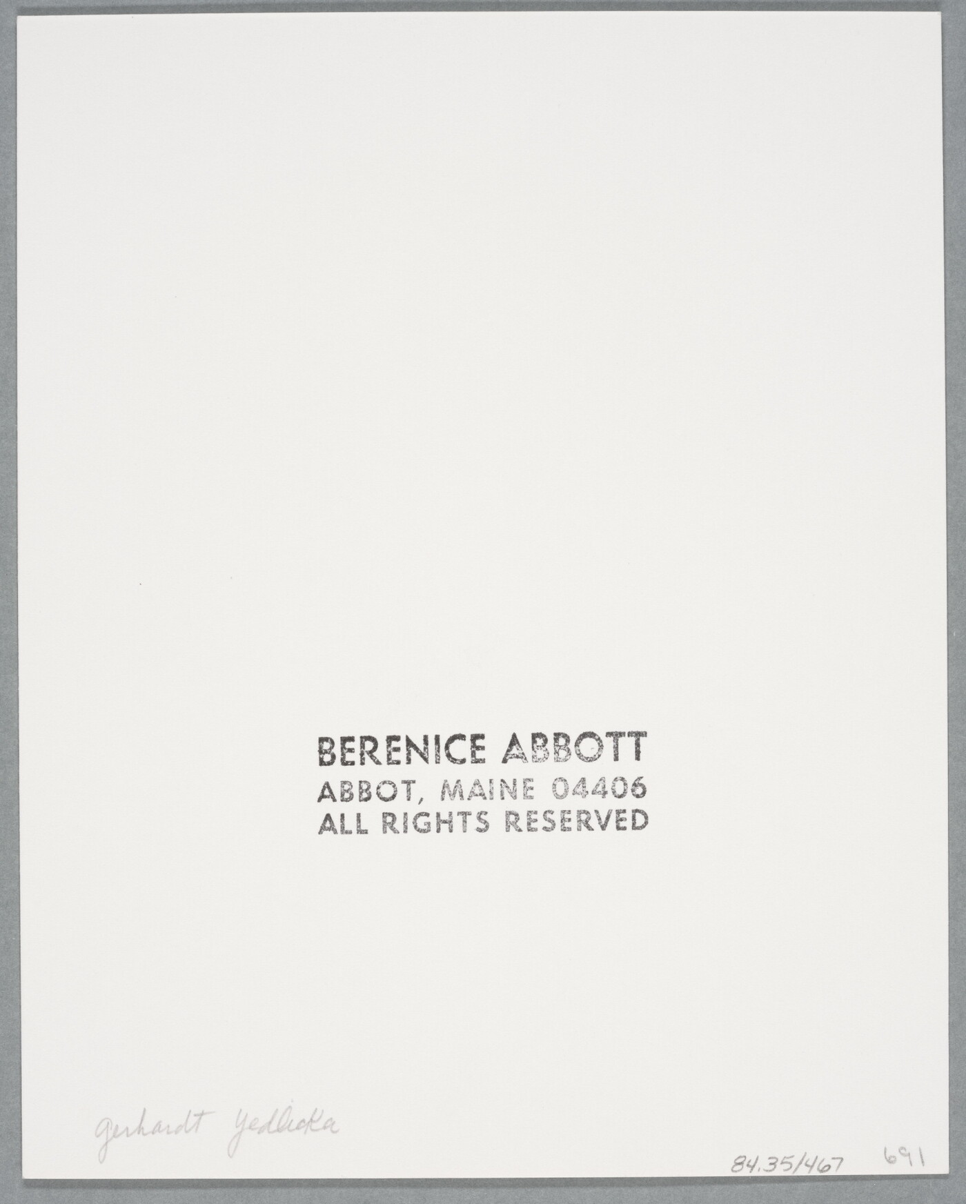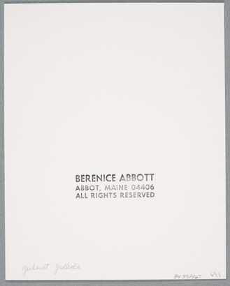 c. [stamp]: BERENICE ABBOTT \ ABBOT, MAINE 04406 \ ALL RIGHTS RESERVED