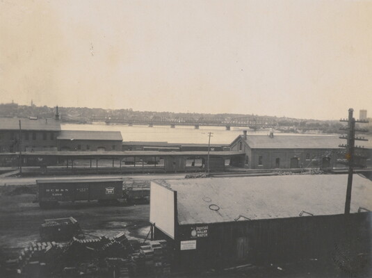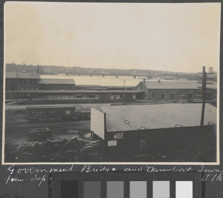 l.l. to l.r. in ink: Government Bridge and Davenport Iowa \ from Top of C B & Q Depot. Rock Island Ills.