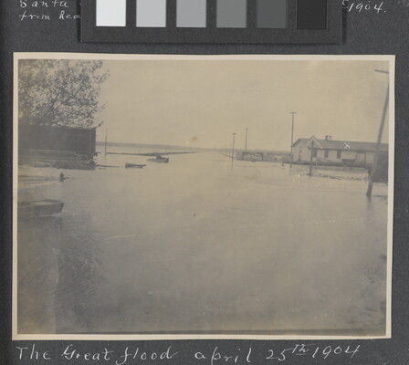l.l. to l.r. in ink: The Great flood april 25th 1904 \ Looking East From Main St. M.K. & T. Depot x \ Chanute Kansas.