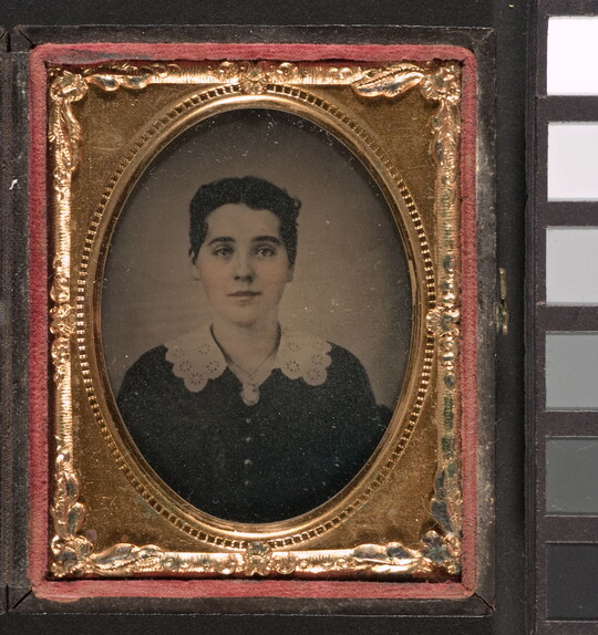 [Young woman in dark dress with lace collar, wearing cameo pendant], ca. 1850