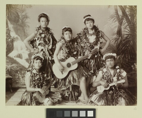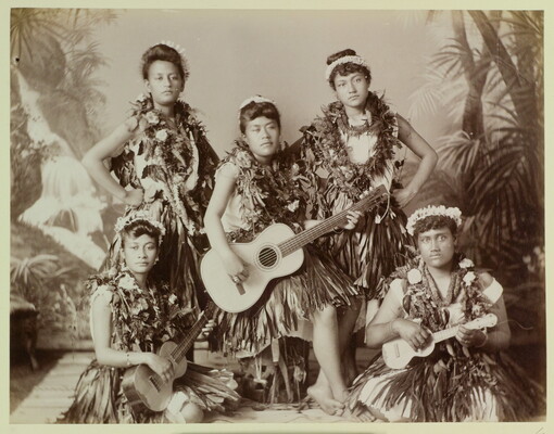 [Group of five young women in grass skirts, leis, flowers, holding guitars]