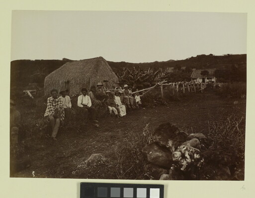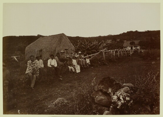 [Group posed along fence in front of grass hut, larger house visible in distance]