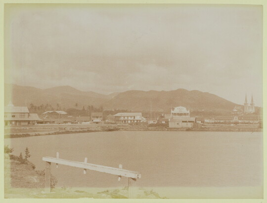 [Harbor scene with buildings along waterfront, mountains in background], ca. 1890