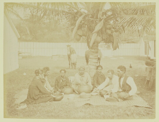 [Family seated on straw mats under palm tree, eating a meal], ca. 1890
