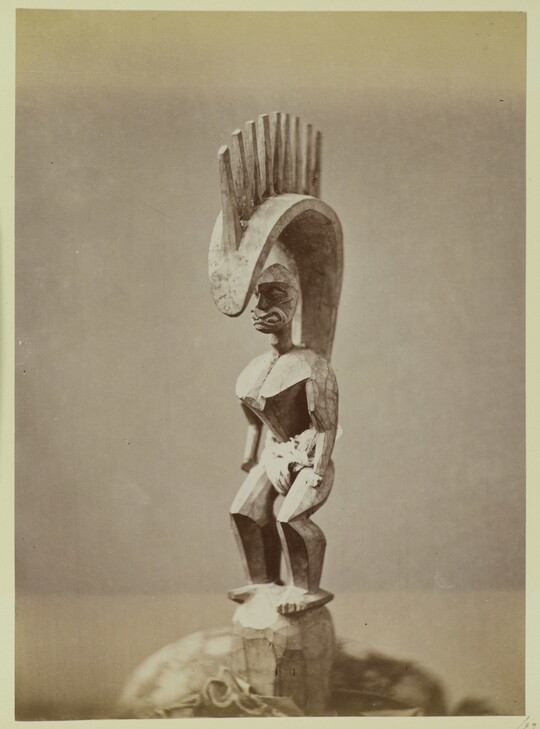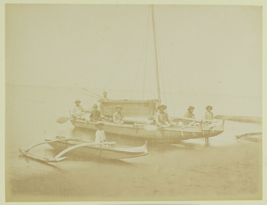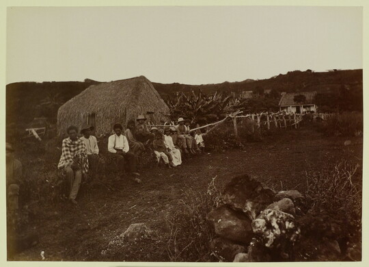 [Group posed along fence in front of grass hut, larger house visible in distance], ca. 1890
