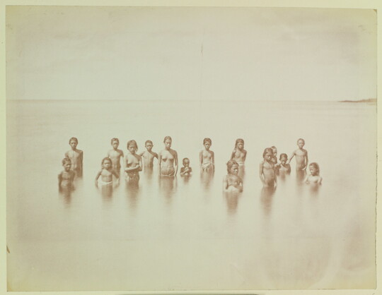 [Group of women and children standing in small canal, others on bank], ca. 1890