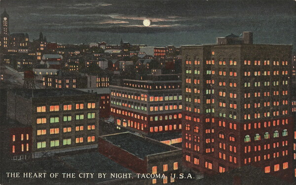 l.l. to l.c. printed: THE HEART OF THE CITY BY NIGHT, TACOMA, U.S.A.